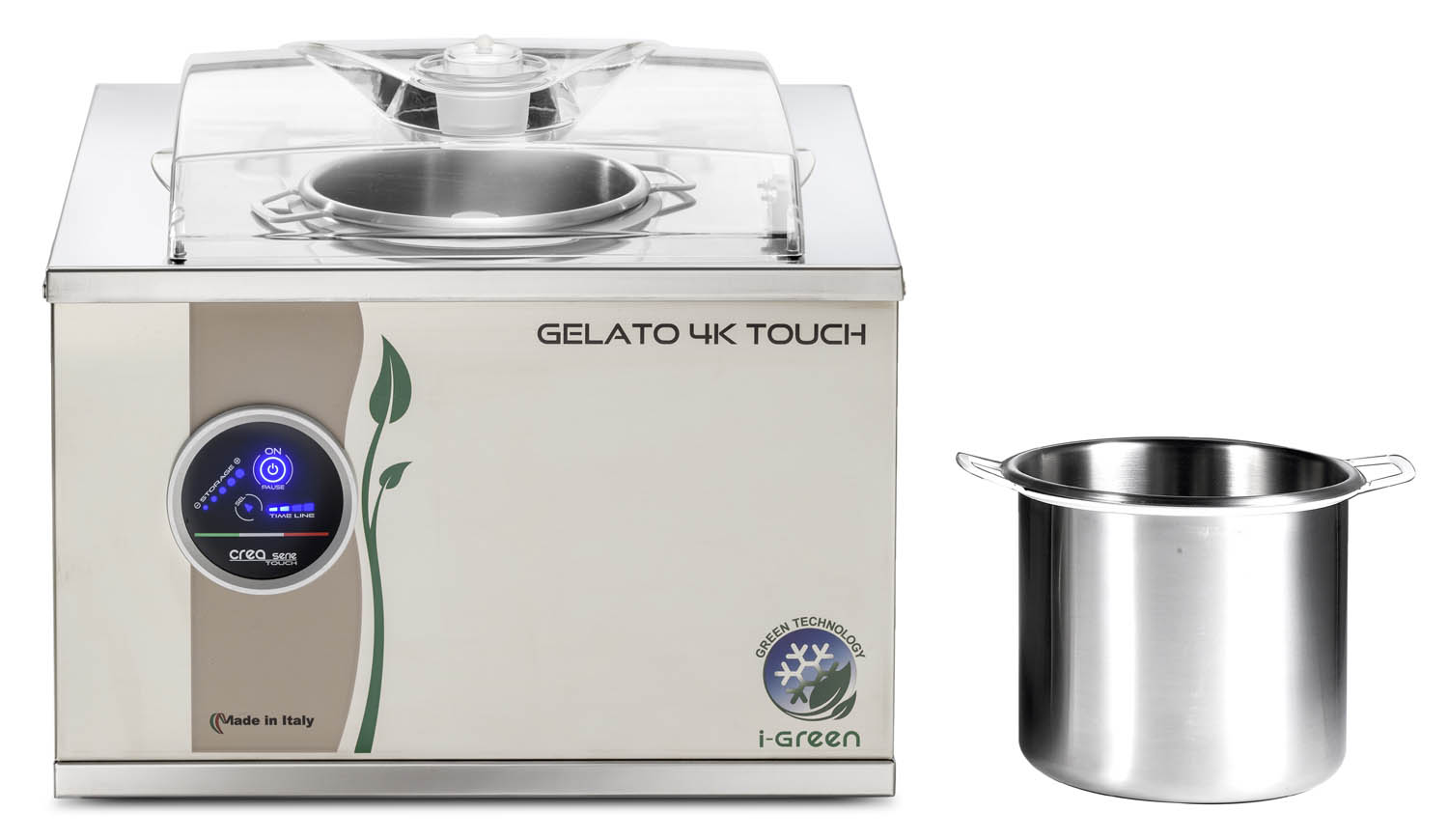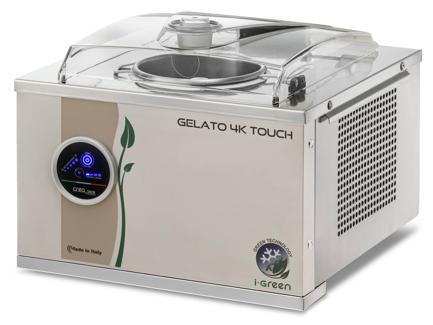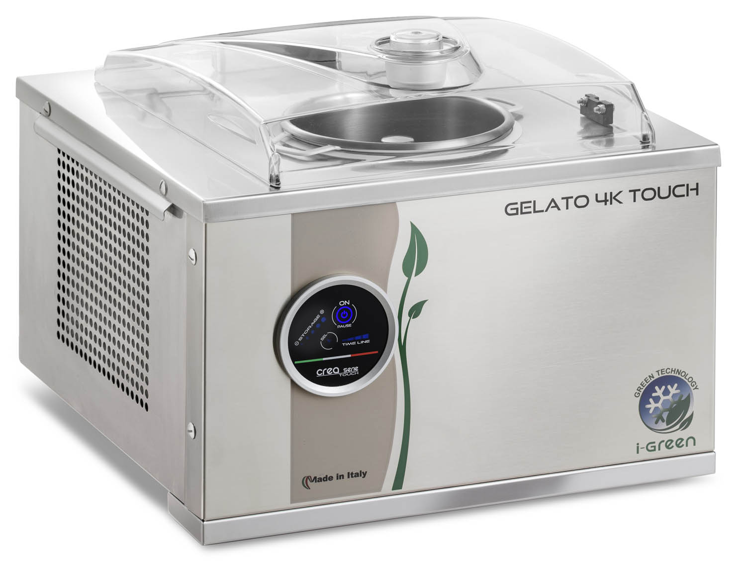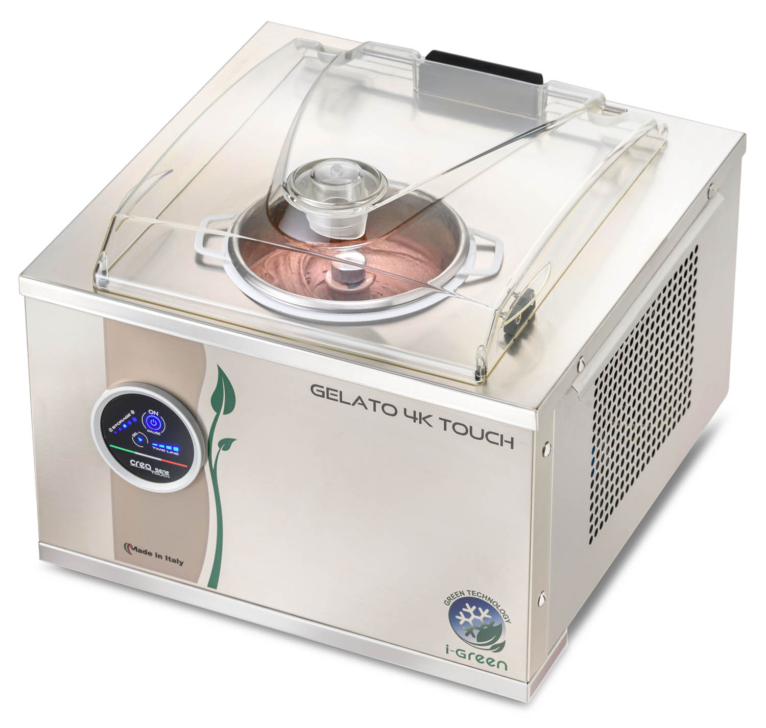Eingebauter Edelstahlbehälter für besten Kühlkontakt • Zur alternativen Nutzung einfach zu reinigender, entnehmbarer Behälter aus Edelstahl • Vollautomatischer Herstellungs- und Konservierungsprozess • Touch-Screen-Bedienung • Elektronische Konsistenzkontrolle • Rührwerk mit Induktionsmotor • Thermoschutzvorrichtung • Rührgeschwindigkeit 65 U/Min. • Umweltfreundliches Kühlmittel R290 • Luftkühlung • Gehäuse Edelstahl • Inkl. Eisspachtel, Abstreifer und Reinigungsbürste • Max. Zutatenmenge 1 kg • Fertiges Eis-Volumen pro Fertigungszyklus Ø 1,5 Liter • Max. Produktion / Stunde 4 kg / 6 Liter • Zubereitungszeit Ø 12-15 Minuten • Eingebauter Behälter 2,5 Liter • Entnehmbarer Behälter 2,5 Liter
