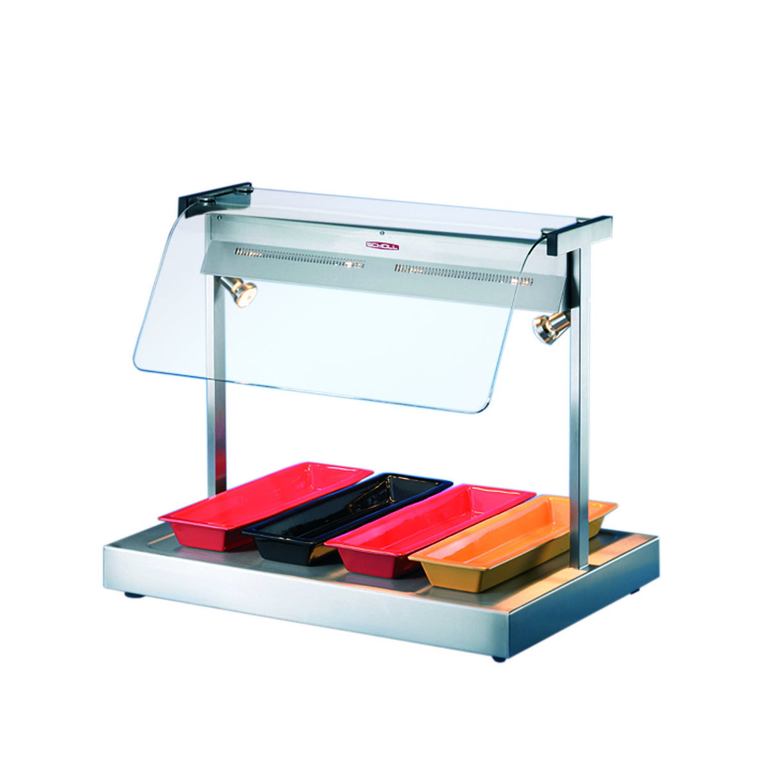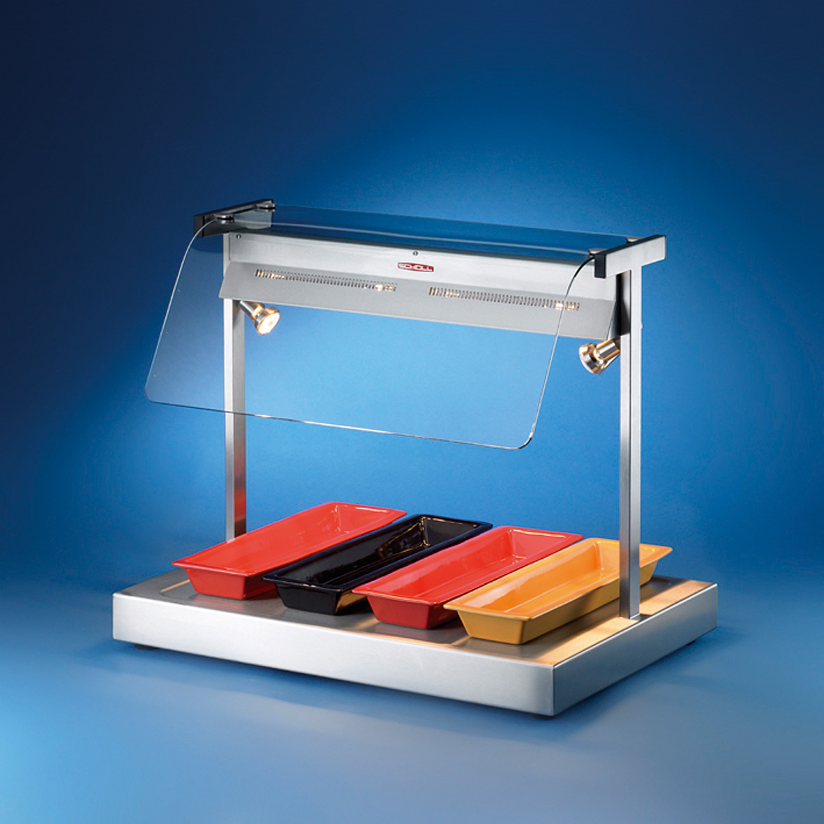 Tiefe 600 x Höhe 700 mm. Ausführung CNS 18/10. Wärmeplatte thermostatisch regelbar von 30 - 150°C, passend für 2 GN-Schalen 1/1. Darauf aufgebaut 1 Wärmebrücke mit 2 IRK-Halogen-Infrarot-Quarz-strahlern. Frontseits mit Hygieneschutzhaube aus Sicherheitsglas. Stützen der Wärmebrücke CNS 18/10. An den senkrechten Stützen je 1 Kaltlichtstrahler 50 W. E-Anschluß: 230 V/2,2 kW.