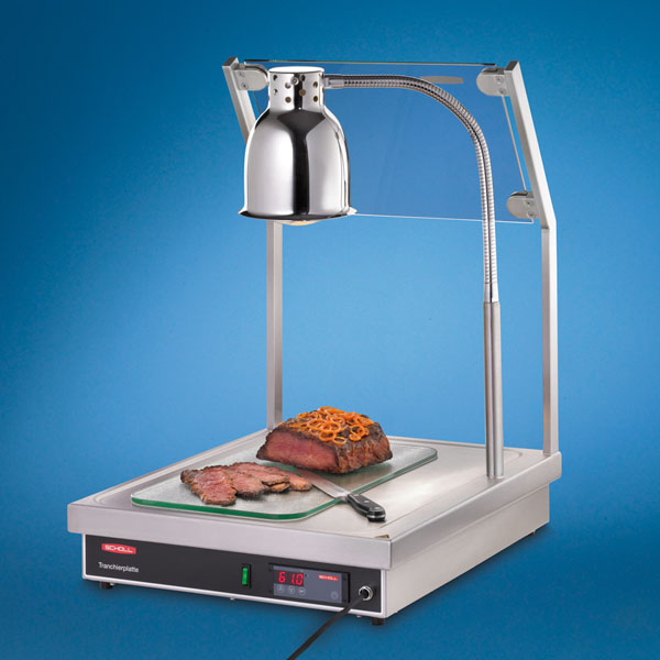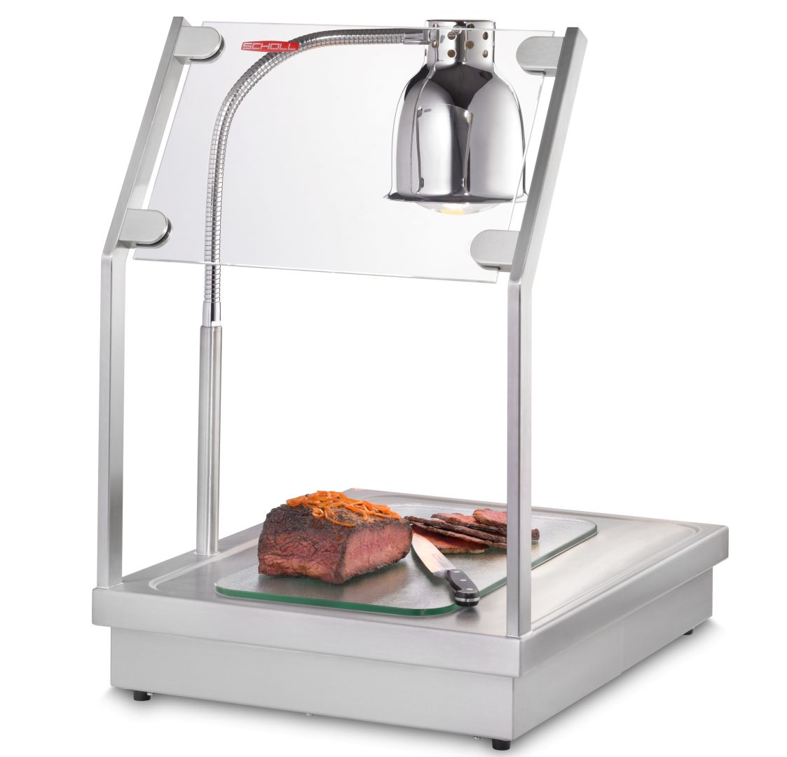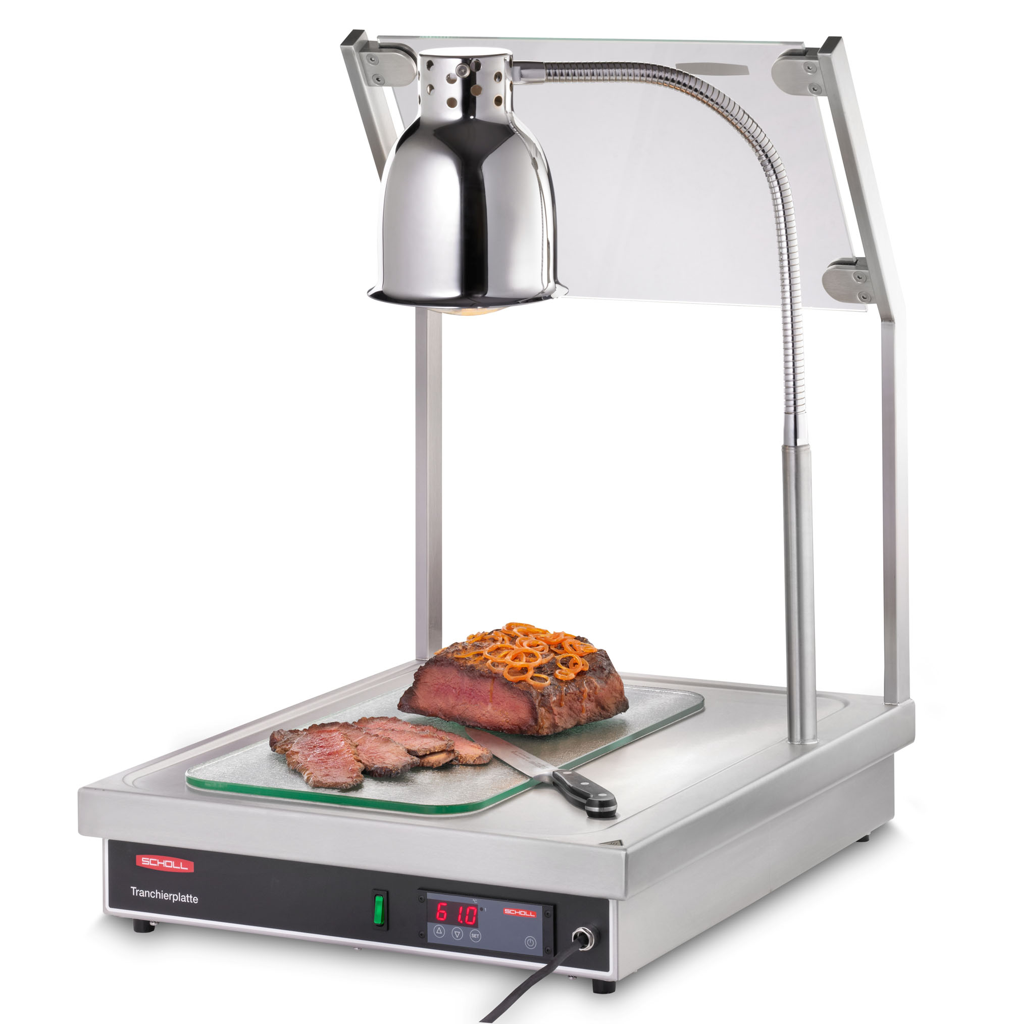 Hier im SCHOLL-GASTRO-ONLINE Shop kaufen Sie die ORIGINAL Scholl Tranchierplatte (carving station) aus Chromnickelstahl. Die Scholl Tranhcierplatte ist mit 1 Lampe ausgestattet und digital regelbar von 30- 100°C. Die herausragende Verarbeitungder Platte, die technische Regelung der Steuerung und der umlaufende Wulstrand auf der Tranchierplatte sind die wichtigsten Eckdaten. Die Tranchierplatte erhalten Sie in 2 Ausführungen. Ausführung ohne Hustenschutz (Modell Nummer TP 90050, Art.Nr.: B3120) und alternativ in der Ausführung mit Hustenschutz (Modell Nummer TP 90050/H, Art.Nr.: B3121). Der Hustenschutz ist auf der Gästeseite angebracht. Selbstverständlich können Sie die Tranchierplatte und Warmhaltestation in jede Art der Gastronomie einsetzen wie zum Beispiel im Imbissbetrieben, im Partyservice direkt beim Kunden vor Ort, in Metzgereien an der Ladentheke, am Buffets aller Art um Ihren Kunden direkt "vor seinen Augen" den leckeren Braten aufschneiden zu können und auch im Strassenverkauf. Scholl steht für Qualität und Nachhaltigkeit, aus diesem Grund trägt diese Wärmestation auch das Gütesiegel "MADE IN GERMANY" und getreu der Philosopie: "SCHOLL ... eine Idee voraus!".