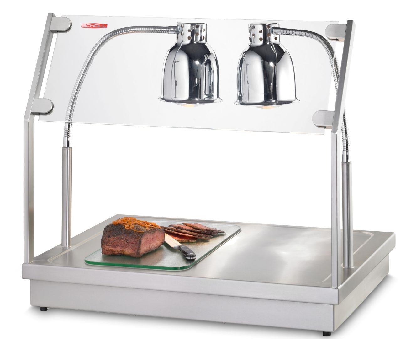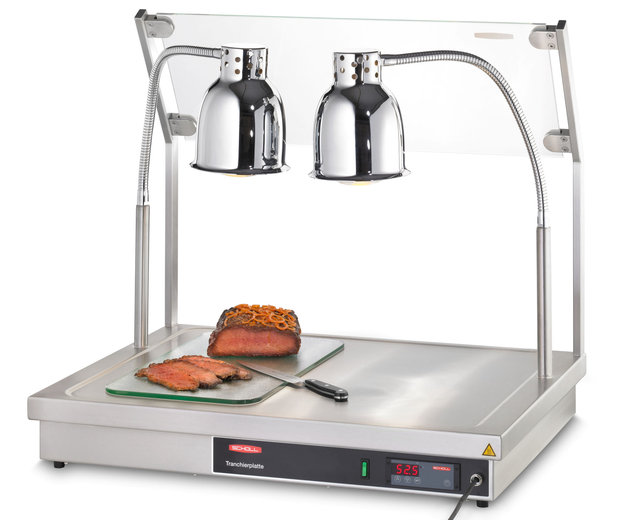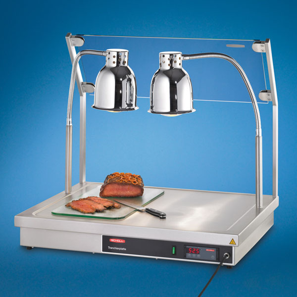Hier im SCHOLL-GASTRO-ONLINE Shop kaufen Sie die ORIGINAL Scholl Tranchierplatte (carving station) aus Chromnickelstahl. Die Scholl Tranhcierplatte ist mit 2 Lampen ausgestattet und digital regelbar von 30- 100°C. Die herausragende Verarbeitungder Platte, die technische Regelung der Steuerung und der umlaufende Wulstrand auf der Tranchierplatte sind die wichtigsten Eckdaten. Die Tranchierplatte erhalten Sie in 2 Ausführungen. Ausführung ohne Hustenschutz (Modell Nummer TP 90080, Art.Nr.: B3118) und alternativ in der Ausführung mit Hustenschutz (Modell Nummer TP 90080/H, Art.Nr.: B3119). Der Hustenschutz ist auf der Gästeseite angebracht. Selbstverständlich können Sie die Tranchierplatte und Warmhaltestation in jede Art der Gastronomie einsetzen wie zum Beispiel im Imbissbetrieben, im Partyservice direkt beim Kunden vor Ort, in Metzgereien an der Ladentheke, am Buffets aller Art um Ihren Kunden direkt "vor seinen Augen" den leckeren Braten aufschneiden zu können und auch im Strassenverkauf. Scholl steht für Qualität und Nachhaltigkeit, aus diesem Grund trägt diese Wärmestation auch das Gütesiegel "MADE IN GERMANY" und getreu der Philosopie: "SCHOLL ... eine Idee voraus!".
