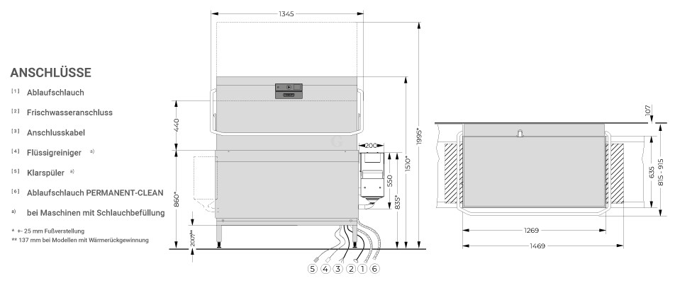 - Tiefe mit Griff 915 mm, Höhe Haube oben 1995 mm