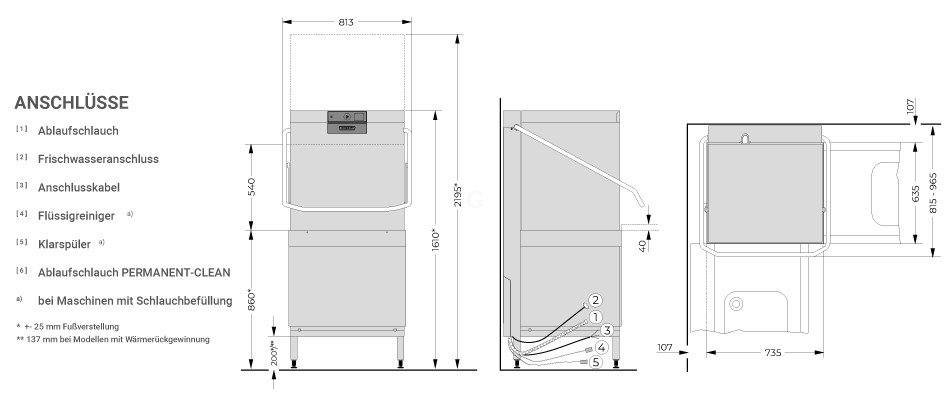 - Komplett anschlussfertig: Zu- und Ablaufschläuche, Anschlusskabel, Flüssigreiniger-Dosierpumpe, Klarspülmittel-Dosierpumpe