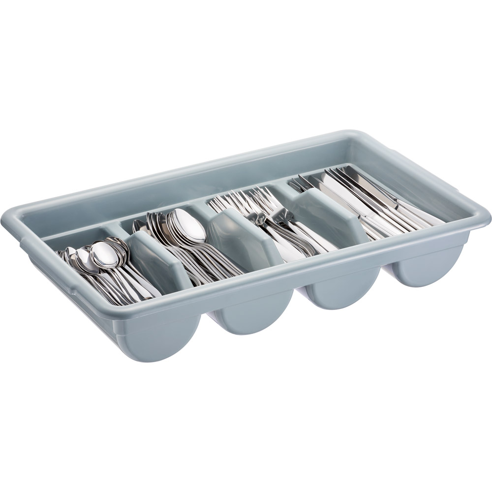 Unerlässliches Tool für die Bereithaltung und den Transport von Bestecken. In den vier tief gemuldeten Fächern mit mittig erhöhten Trennwänden lassen sich alle Hauptbestandteile eines Bestecksets getrennt unterbringen. Die seitlichen Griffmulden erleichtern Ihnen die Handhabung im Gastroalltag. Für die einfache Reinigung kann der Besteckkasten in die Spülmaschine!Polyethylen GN1/1 4 Mulden spülmaschinengeeignet mit Griffmulden beständig gegenüber Säuren, Basen, Ölen und Fetten praktisch, stapelbar, langlebig für Transport und Bereithaltung von Bestecken